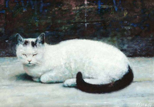 In the painting we see an adorable white kitten with black patches on its ears and tail, resting against a dark, slightly blurred wall. The composition is simple yet full of charm. Cool colors dominate—whites, grays, and muted blues—which create a calm, dreamy mood. You can tell this kitty is just having a great chill day. The painting technique the artist used is probably oil, with delicate, impasto brushstrokes. It seems it was meant to be soft and subtle—and it is. The brushstrokes create gentle yet distinct textures, giving the fur a fluffy quality. The painting emanates tranquility, and at the same time a strange warmth that makes you want to cuddle this little sweetheart. Some may feel nostalgia, others simply peace, and still others will be reminded of their childhood with a household pet. A feline friend that reminds us that moments of quiet and relaxation are priceless. You instinctively smile, thinking, “Kitty is sleeping!” A work of art that draws you in, captivates you, and leaves you with a sense of gentle contemplation.