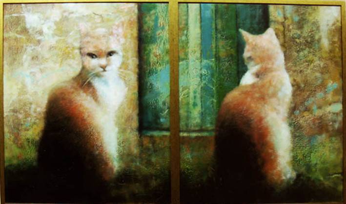 The painting depicts a mysterious cat whose gaze draws the eye, as if it wanted to tell us something. The composition is divided into two segments, creating an intriguing tension and inviting a closer look at the details. Warm, soft colors—browns and greens—dominate, bringing a cozy, slightly nostalgic atmosphere. The cat sits against a moody, bucolic landscape, which evokes a sense of calm but also curiosity. There is something magical in its gaze, something that pulls you in and won’t let you look away. The artist employed a technique reminiscent of Impressionism, with slightly blurred contours that give the painting a dreamy quality. The composition is harmonious, and the colors subtly blend into one another, creating the effect of a delicate mist. It’s a picture that says, “look at me, and you’ll discover more.” For me, it’s like a small secret hidden in everyday life. When I look at the piece, I feel a warm childhood memory of gazing at my own cat through the window. A child might say: “This cat looks like it has an important secret!” The painting is simple, yet full of hidden meanings that can be discovered endlessly.