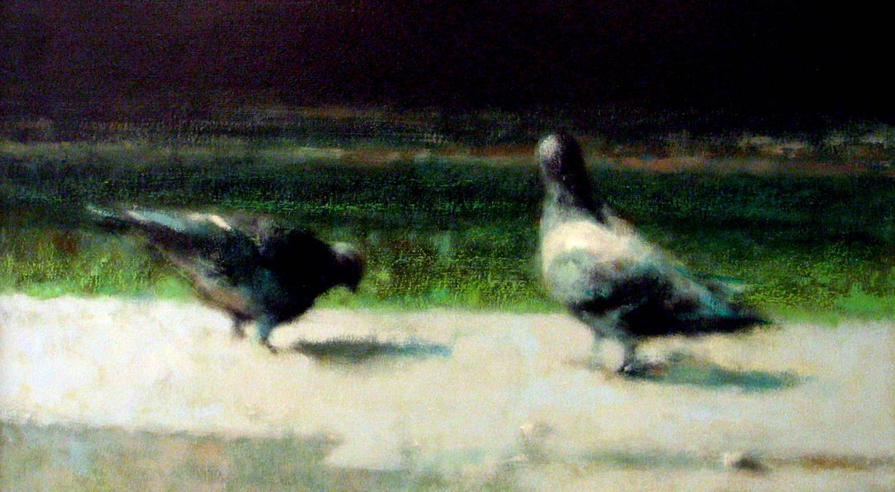 The painting depicts two pigeons on a sidewalk, surrounded by a subtle palette of colors. In the background, dark green dominates, reminiscent of a summer park, while the birds contrast with their grays and whites. The composition is simple yet remarkably expressive; the main subjects are placed at the center, set apart from the background by a slight blur. The light, though subdued, gently highlights their silhouettes, lending them a touch of majesty amid the everyday. The atmosphere is calm, almost nostalgic. I feel as if I were really there, watching their daily struggles. Mostly peaceful, one might say. The artist employed an impressionistic technique that allows one to focus on the impression of the moment rather than minute details. The brushstrokes are distinct yet soft, giving the whole a slightly misty effect. The painting evokes a sense of peace, but also a slight sadness. Eh, the pigeons just walk along, while the world around them keeps changing. For a 7-year-old: the little pigeons look like they’re searching for crumbs for breakfast! The viewer may feel as if they’re on a walk in the park, where the silence is broken only by the sounds of birds. After a moment of reflection, I find myself wondering how often we overlook the beauty of such simple scenes amid the daily hustle and bustle of life.