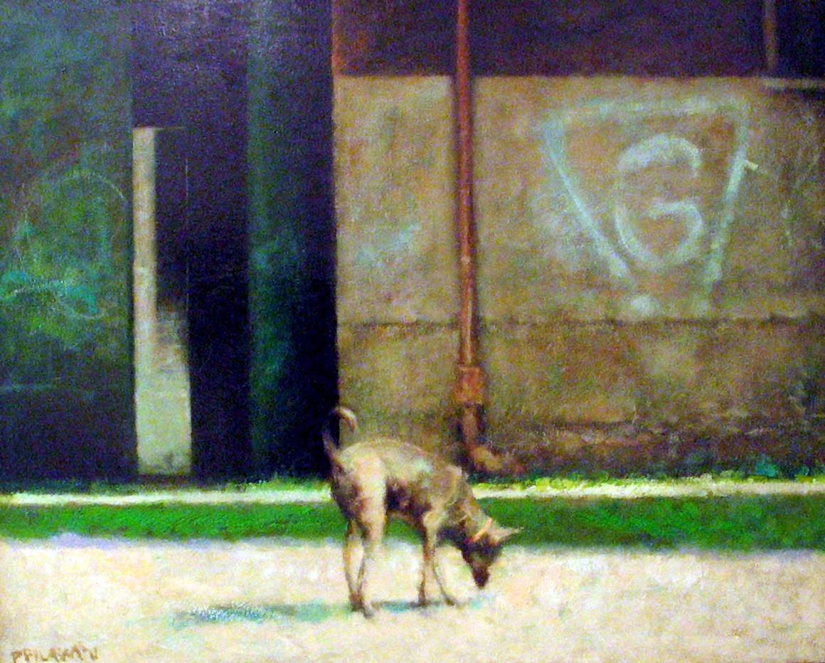 In the painting we see a dog on the street, lowering its head as if searching for something. The dominant colors are greens and browns, creating an urban atmosphere that almost evokes old city walls. The composition is fairly simple, with the dog at the center, which immediately draws our gaze to its silhouette. The mood of the painting is calm yet slightly melancholic, like a moment of solitude frozen in time. Such a mood may make the viewer feel a note of nostalgia or reflect on urban life. The artistic style resembles Impressionism, with delicate brushstrokes and a subtle play of light. The technique, in which the artist uses gentle transitions between colors, gives the painting a certain softness and a dreamy look. It makes you think of an ordinary day when one pauses for a moment to look around and notice the beauty in the everyday. The viewer may feel a sense of calm and reflect on life’s simple joys. Ha, a doggy! And such a sight often brings a warm smile to one’s face. It gives the feeling that even in the bustle of the city one can find moments of quiet and peace. The artist delights us with the ability to capture an ordinary moment in an extraordinary way. Isn’t that magical?
