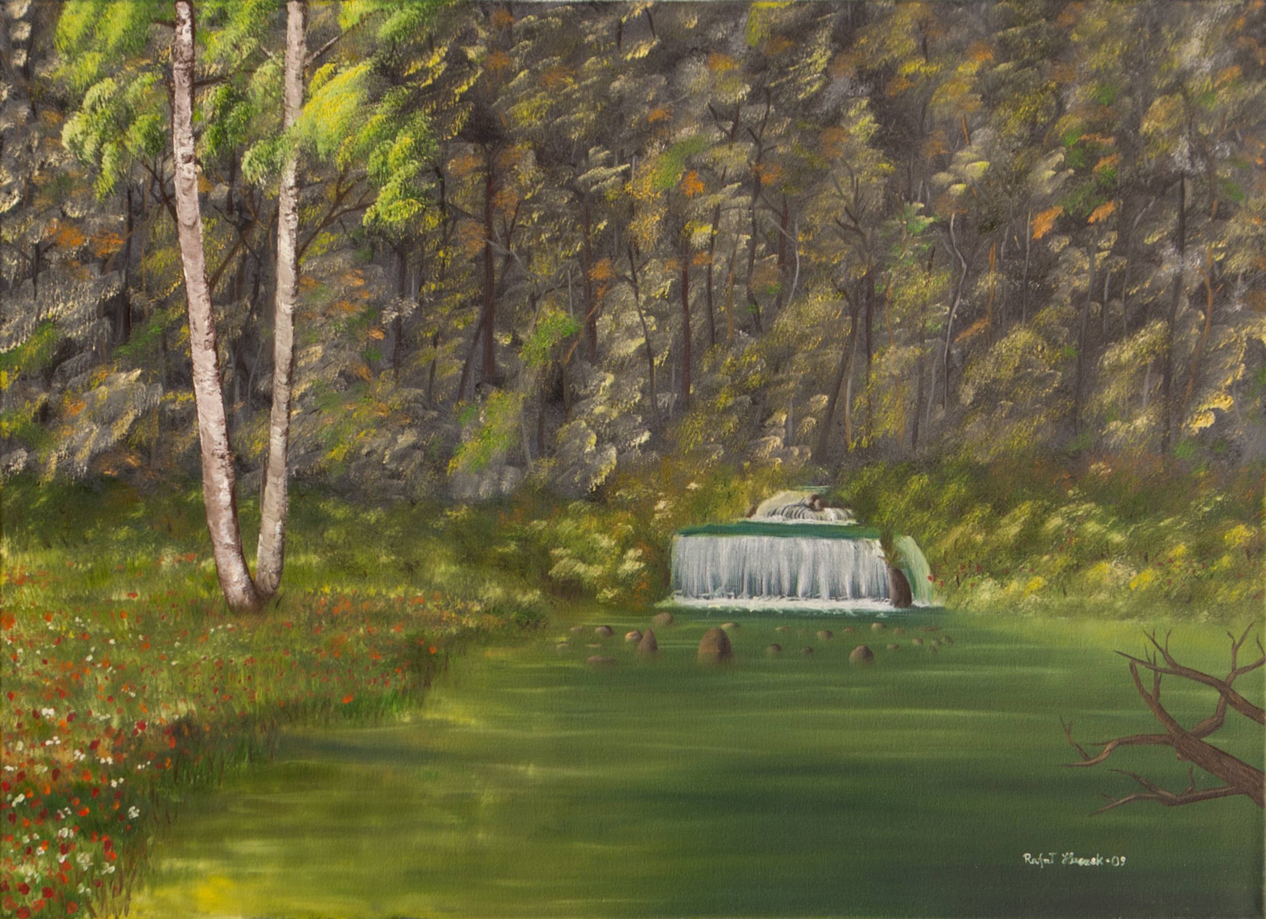 This painting is a captivating forest scene, full of greenery and tranquility. The first thing that catches the eye is two slender trees in the foreground, as if guarding the entrance to the forest. Shades of green and brown mingle with subtly interwoven yellow and orange tones, creating a beautiful contrast with the darker areas of the background. At the center of the painting, a modest waterfall gently cascades into a stream. It is like a magical fountain hidden in the woods. The atmosphere of the painting is calm, like nature’s quiet whisper. The artist has used a soft color palette and a technique of subtle blending, which gives the whole scene a dreamlike quality. You can almost feel the cool breeze and the scent of moss in the air. It is a painting that invites reflection. It reminds us of the silence and harmony so often missing in everyday life. As a seven-year-old might say, it’s a place where fairies live. The viewer may feel an inner calm, but also a gentle longing for nature, of which we are a part. Sometimes it’s worth pausing, simply being, and listening to the silence. The painting allows one to find within oneself an inner peace that is in harmony with the surrounding world.