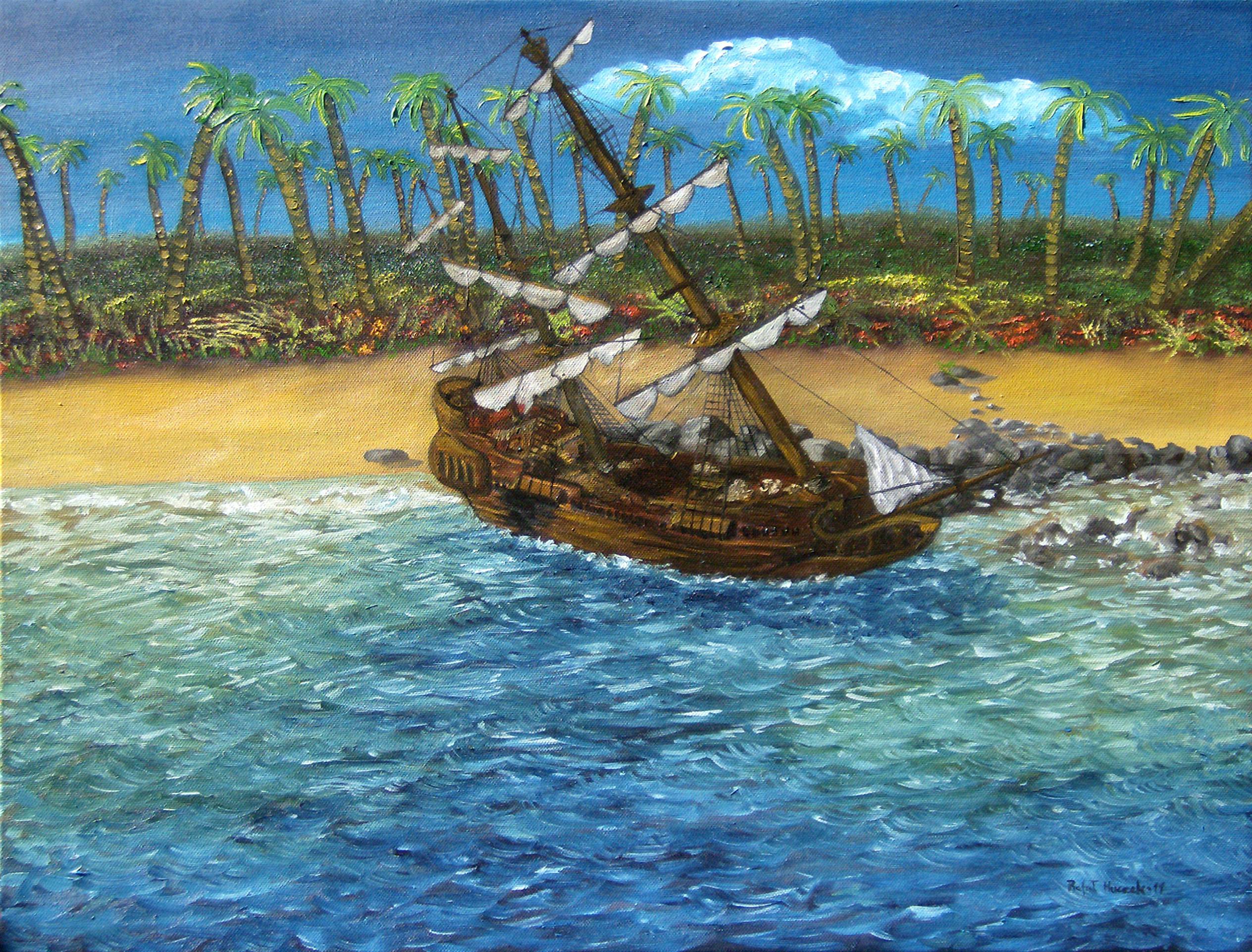 The painting depicts a tropical island scene, where an old-school sailing ship brushes the sandy shore. The colors are primarily rich shades of sea blue and palm green, with accents of beige sand. The shapes are delicate yet distinct, with a series of long, slender palms dominating the background. The composition feels perfectly balanced, guiding the eye from the ship toward the picturesque shoreline. The atmosphere exudes calm and a touch of nostalgia, evoking a sense of escape from everyday life. Though full of vivid colors, the landscape seems to whisper of adventures and mysteries. Artistically, the painting uses the impasto technique, which gives the water its dynamic “touch.” This style creates a sense of movement, as if the waves were actually striking the hull. Emotions? I see freedom and the discovery of new horizons here. Those palms are like a waking dream. A kid would probably say, “The ship is sailing off on an adventure!” And that might be true, my friend. Regardless of age, every viewer can feel that excitement and desire to explore. I find myself wondering what stories this ship could tell. The painting exudes a retro style, reminiscent of classic seafaring adventures from centuries past.