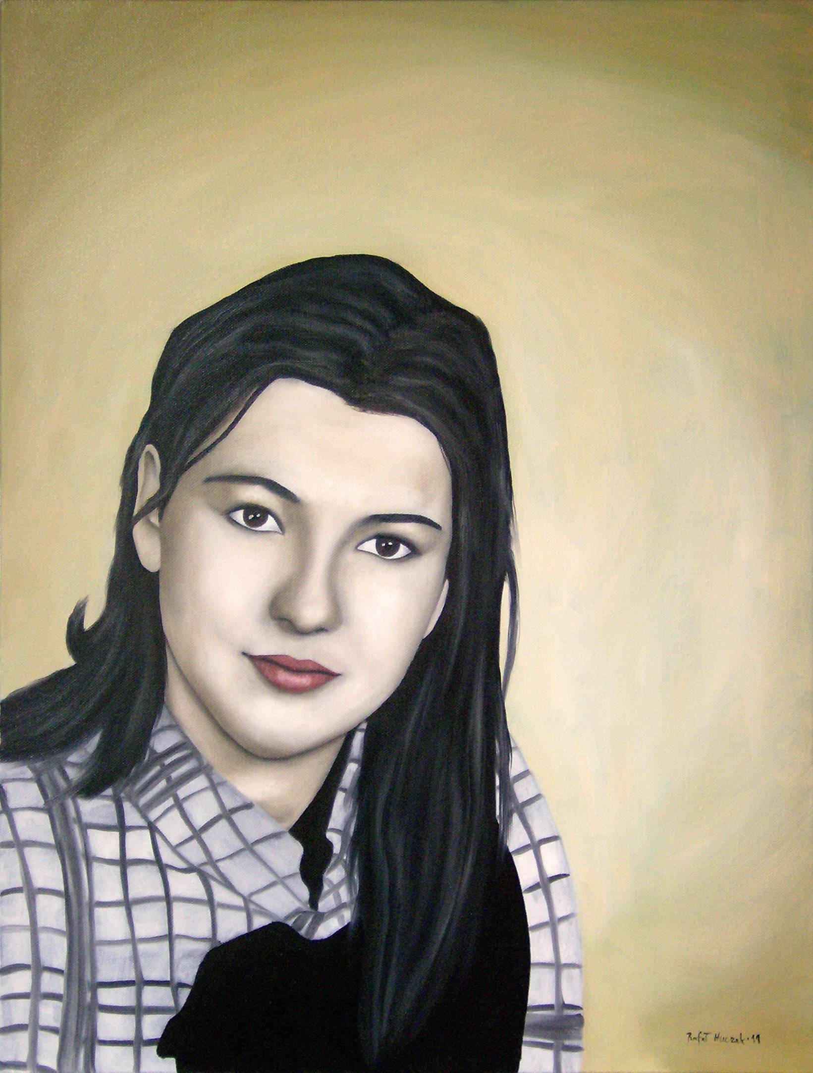 The painting depicts a portrait of a woman with delicate features, rendered in a subdued color palette. The background is a warm shade of beige, which perfectly accentuates the subject’s face. Shades of gray and white dominate, especially in the woman’s clothing, which is adorned with a subtle check pattern. Her dark hair contrasts with the light background, adding depth to the composition. In her eyes one can see calm and mystery. The whole piece emanates a certain nostalgic mood, yet also warmth, making the viewer feel as if they were in the presence of someone dear. The artist employs a technique that combines realism with gentle impressionistic accents, creating an intriguing dynamic between precision and the freedom of brushstrokes. The emotions the painting evokes are a mix of reflection and gentle poignancy. Looking at this portrait, one can wonder who this person is, what she is thinking, what stories are hidden behind her eyes. Maybe she's thinking about a funny story from her childhood. Elongated forms and a harmonious composition contribute to a balance between detail and the whole, which is characteristic of this style. As we admire the painting, we feel that the artist put a great deal of heart and feeling into it. This painting reminds us that art is not only what we see, but also what we feel. Wow, how is it painted so beautifully?