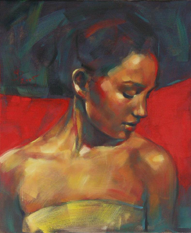 The painting is dominated by a subtle blend of warm colors, such as reds, browns, and golden yellows. In the foreground, a woman shown in profile gently lowers her head, as if lost in thought. The background features an intensely red rectangle that contrasts with the darker tones of the surroundings, lending the work depth and mystery. The composition is harmonious in its own way, though it does not lack free brushstrokes that add dynamism to the whole. The atmosphere of this painting is remarkably evocative, even intimate. One senses a certain calm and introspection, which makes the viewer instinctively slow down and admire. The artistic style alludes to Impressionism, with expressive elements that place emphasis on emotion and light. This combination makes the painting draw the eye and not let the viewer look away, as if saying “come closer.” The work evokes a wide range of emotions. For some, it may be an expression of melancholy; for others, the tranquil beauty of a moment frozen in time. The observer may see their own reflections in the woman’s face, which lends the painting a sense of universality. The delicate play of light and shadow, though seemingly chaotic, is deliberate and full of artistry. The painting brings to mind questions about who the person portrayed is and what story she hides behind her closed eyes. Perhaps a child would say, “She must be thinking about something nice.” That candor can reveal how varied the interpretations of the same work can be. The artist surely aimed for his work to speak many languages of emotion.