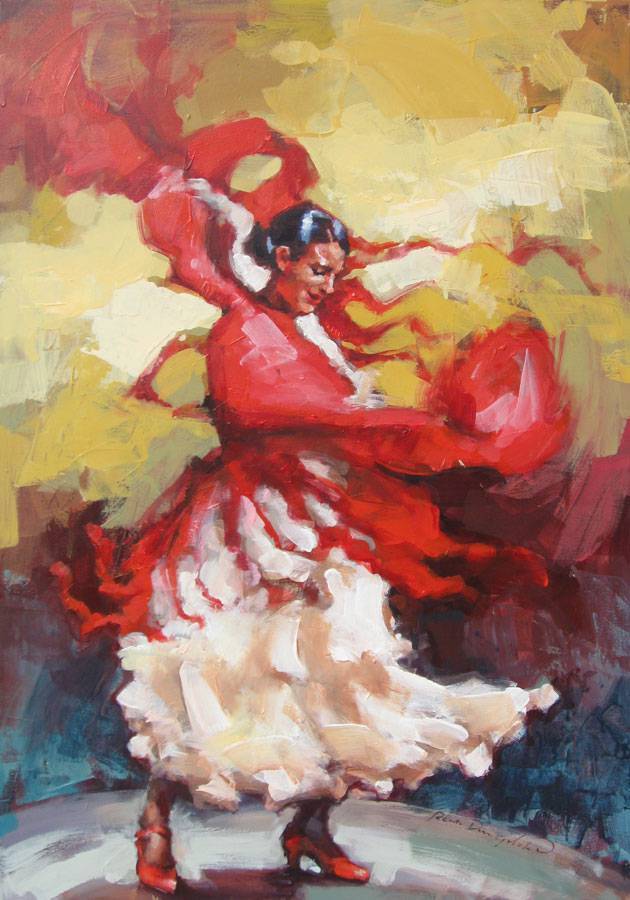 In the painting we see a flamenco dancer captured in full motion. Intense reds and deep yellows dominate, creating a dynamic composition and giving the work a pulsating quality. The dancer’s dress, full of ruffles and swirling fabric, seems to float in the air, drawing the eye with vivid contrasts. A bright, blurred background suggests motion and energy, enhanced by the impasto technique—thick brushstrokes add texture and a sense of three-dimensionality. The atmosphere is full of passion, as if music were playing from the canvas. The artist used gnarly techniques to capture the essence of the moment. In the brushstrokes you can feel movement and rhythm, almost as if we could hear the sound of castanets. The painting radiates strong emotions, engaging the viewer in the inner fever of the dance. The dancer looks like a superheroine who conquers the world with her energy. One can feel a spectacular mix of emotions—wonder, admiration, and even a touch of envy at that beautiful charisma and elegance. The painting leaves the viewer with a sense of immersion in another world, where only rhythm and movement matter.