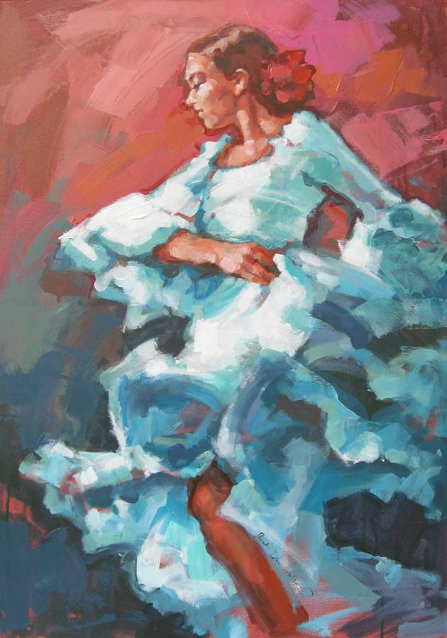A painting with a dynamic scene depicts a dancer in motion, dressed in a billowing gown in shades of blue that almost seems to dance with her. The colors are vivid and intense, with accents of red and pink dominating the background, contrasting with the turquoise costume. The background itself blurs, adding depth and suggesting movement. The artist uses quick, confident brushstrokes; the technique is bold, impressionistic. You can feel the energy and passion sealed within the painting, something like an echo of flamenco. The viewer’s eye is drawn to the position of the hands and the dancer’s facial expression—focused, full of emotion. I feel as if the music were thundering in my ears. Wow, how amazing it is when the dancer leaps! The painting evokes nostalgia for Spanish evenings, when the sun sets against the red of brick. There is something magical about it that makes you want to be there, to feel that moment. It’s like capturing a fleeting moment of joy, frozen in time.
