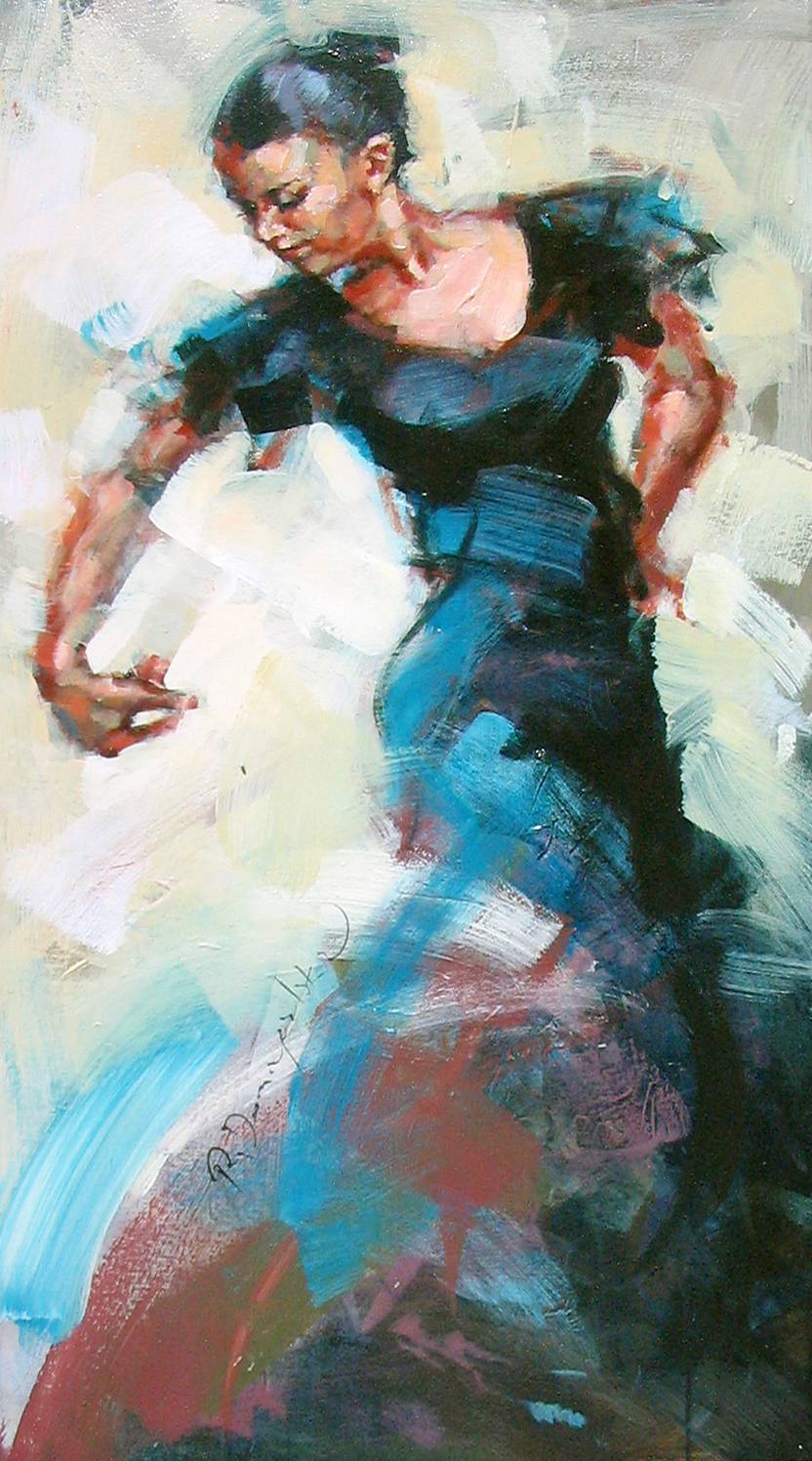 The painting depicts a dynamic figure of a dancer whose movements seem to break the boundaries of the canvas. The colors are vivid and contrasting, with black dominating the costume, which harmonizes beautifully with blue and red patches in the background. These dynamic brushstrokes infuse the whole with energy and intensity, underscoring the expression of the dance. The atmosphere of the painting is full of passion and energy. The artist used the impasto technique, applying paint in thick layers, which adds texture and depth. This style gives the painting a unique character, as if each brushstroke were a testament to emotion. The painting can evoke a variety of emotions in the viewer. One may feel joy from watching the dance, a sense of freedom, and even inspiration to explore one’s own creativity. The childlike “how cool” may be a natural reaction to the sight of the whirling figure. What strikes me personally is the power of the moment captured in motion—“freedom” at its finest. The painting plays with perception, encouraging reflection on the transience of the moment. With every moment I look at the dancer, I feel as if I can almost hear the music she is moving to. It is a beautiful symphony of color and form.