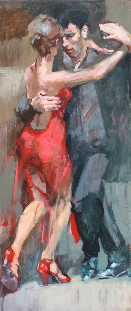 This painting is a dynamic dance of colors and emotions. Warm reds dominate, drawing the eye and infusing it with vitality. The figures are in motion, lost in the passion of dance. The composition is harmonious, and the dance is captured in a moment of silence, when everything seems suspended in time. It’s like a moment in a film, a freeze-frame full of emotion. The atmosphere of the painting is intense. You feel as if you were there, right beside it, hearing the music and sensing the pulsating energy. The artist used the impasto technique, giving the work texture, which makes the painting seem to live a life of its own. The brushes practically dance across the canvas, like the depicted couple. The painting evokes a sense of awe and longing. It may remind you of unfulfilled dreams or moments full of joy. “I like it when they dance,” a child would say, seeing the colors and movement. I think it’s like sealing a single emotion inside a cover. It is beautiful and melancholic at the same time. I can say that it’s a true “story in motion.” The painting draws you in and doesn’t let go.