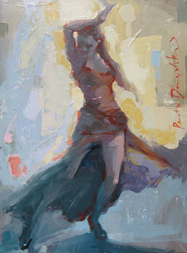 The painting is full of life and energy, and its dynamic composition catches the eye immediately. Colors dance across the canvas: from warm yellows and oranges to cool blues and purples. The figure in the foreground appears to be in motion, immersed in dance, which lends the whole scene a dreamlike quality. The artist used the impasto technique, applying the paint thickly, which adds texture and depth. The atmosphere is full of passion and spontaneity. You can almost feel the echo of music filling the air. The style is a blend of classical Expressionism with modern accents. The brushstrokes are bold and assured, yet soft, making the painting radiate both strength and delicacy. There is a nostalgia for fleeting moments that inspire and move. The painting may evoke various emotions: joy, wonder, and even a longing for the elusive beauty of the moment. A child might say, “It looks like a magical dancer casting spells.” The whole composition has something magical about it, making us dream of journeys into the unknown. Someone might think, “I wish I could dance like that.” The painting is like an invitation to pause for a moment, to feel the rhythm of life and let yourself be carried by it.