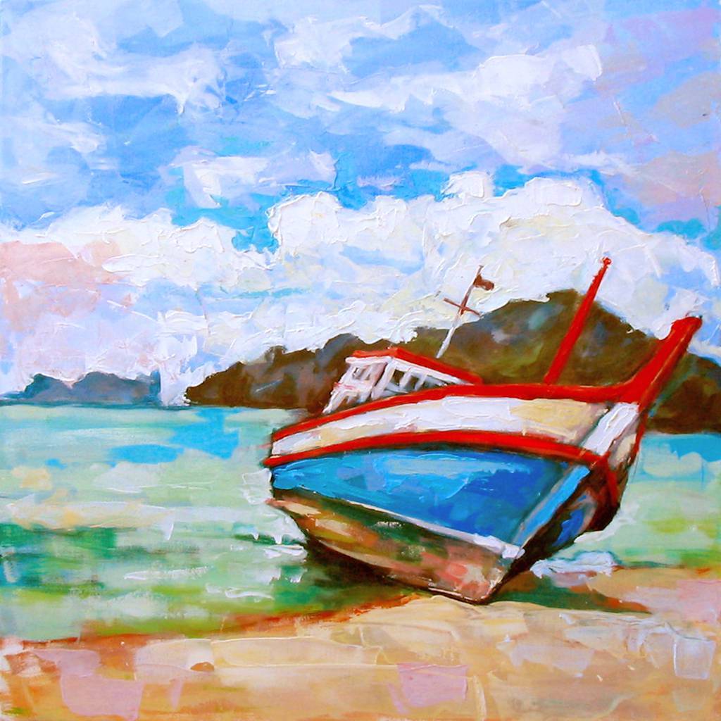 Vivid colors dominate the painting—the intense blue of the sky, the green hues of the water, and the browns of the beach contrast perfectly with the red-and-white hull of the boat. The shapes are dynamic yet slightly blurred, giving the work a hint of Impressionism. The composition leads the eye from the boat across the water to the distant hills. The cloudless sky and the lazily rocking boat create a calm atmosphere, reminiscent of vacation bliss. Sailing nostalgia, right? The artist uses the alla prima technique, painting quickly, wet-on-wet, which lets him capture the fleeting moment. Thickly applied brushstrokes inject energy into the painting. You can almost feel the wind in your hair, maybe even hear the murmur of the waves in your ears. The painting evokes in the viewer a sense of peace, but also a longing for faraway journeys. For me it’s like returning to a time when everything seemed more “awesome.” The boat looks like something out of a fairy tale—at least that’s how a 7-year-old would put it. The painting’s formal style harmonizes with its unpretentious charm. Looking at this landscape, you can let your thoughts escape the everyday and dream of new adventures. I like how the artist plays with light and shadow, creating a space full of dreams.