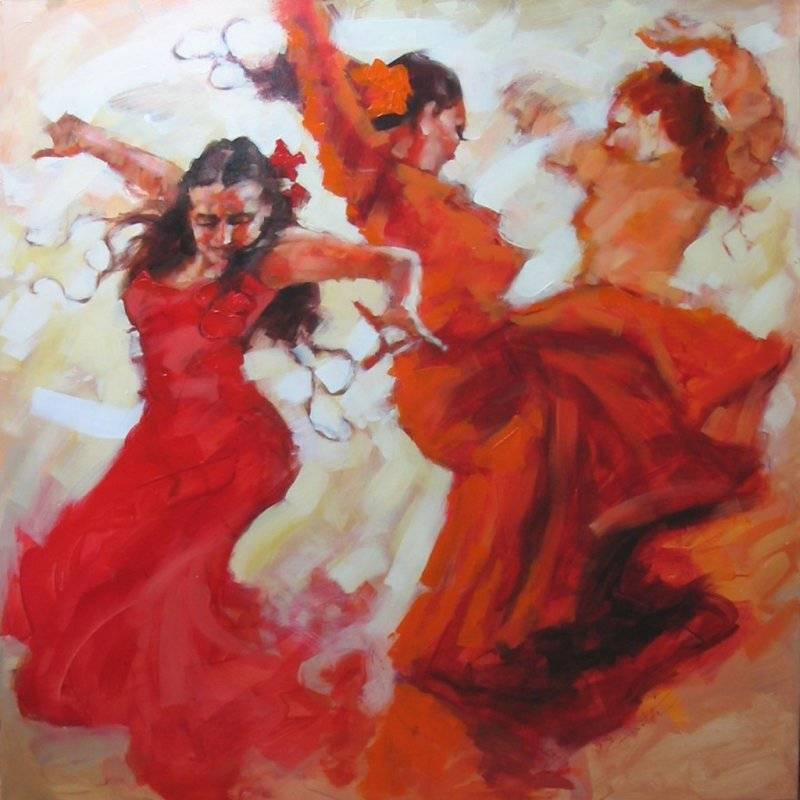 In the painting we see three women absorbed in flamenco. The dominant red of their dresses blends with the background, creating a fiery mix of colors reminiscent of a Spanish sunset. Expressive movements, captured with fluid brushstrokes, convey dynamism and passion. The figures almost whirl across the canvas, their silhouettes blurred, which heightens the sense of movement and vitality. It’s worth noting how the artist plays with light and shadow, adding depth to the work. The atmosphere is electrifying, full of expression and energy. Looking at them, you can almost hear the music and the stamping of heels. It’s like an explosion of emotion. The style of the painting recalls Impressionism with a touch of abstraction, where what matters is not detail but the fleeting nature of the moment. Loose brushstrokes emphasize the dynamism and constant motion. The painting may evoke feelings of joy, admiration, and even a longing for energy and passion. It brings a spontaneous smile and reminds us of the magic of dance that brings people together. “Wow, the ladies are dancing amazingly!” a child would probably say, enchanted by the colors and movement. The painting is vibrant, lively, full of emotion. It’s a work that lingers in the memory.
