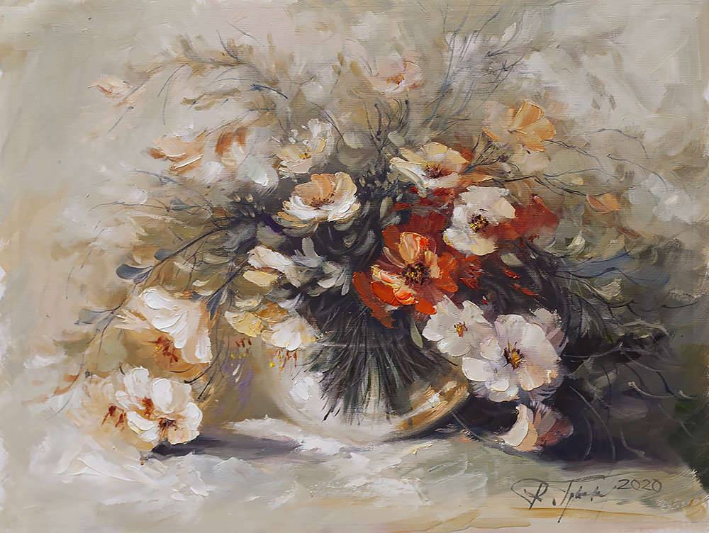 In the painting we see a wonderful composition of flowers that explode with color on the canvas. Warm shades of beige and white dominate, along with vivid, luscious reds. The flowers are scattered in harmonious disorder, creating a visual symphony that draws the eye. I admit, this painting moved me somehow, as if I’d glimpsed a piece of a beautiful garden frozen in time. The atmosphere is calm and at the same time full of life. The painting radiates a distinctive warmth that envelops and soothes. The style is delicate, with light brushstrokes creating a subtle texture. The artist uses impasto, where thicker layers of paint add depth and three-dimensionality. The painting can evoke various emotions—from joy to a gentle melancholy. Or maybe that’s just me. It reminds us of the fleeting beauty of nature which, though momentary, leaves a lasting mark in memory. It's like a whisper of spring on a canvas. That’s how a seven-year-old thinks: "Flowers are like butterflies that don’t fly." Overall, it is immersed in a delicate, almost impressionistic style, which lends it lightness. It is a true work of art that can speak to anyone who gazes at it.