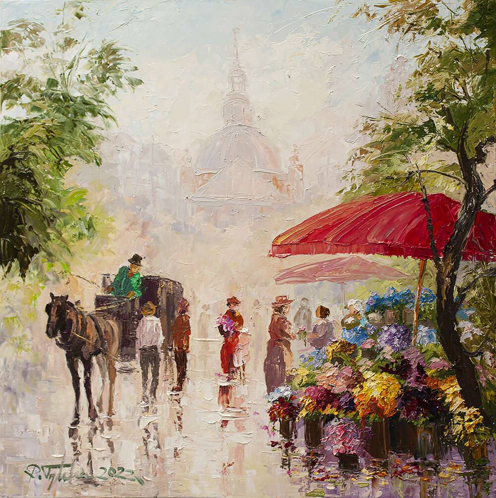 The painting depicts a vibrant city scene, where charming colors catch the eye. Reds and greens dominate, and flower stalls brimming with colorful petals add vigor. A horse-drawn cart makes its way through this picturesque market. A large red umbrella spreads out beneath a tree, drawing the eye with its intense hue. People move about with a faint hint of haste, and their attire evokes the spirit of another era. The scene exudes calm and the nostalgic charm of bygone days. The whole is painted in an Impressionist style. The artist employed the impasto technique, which lends the painting texture and dynamism. The brushstrokes are noticeably loose, enhancing the impression of lightness and the fleeting nature of the moment. Though full of motion, the work creates an atmosphere of calm, as if time had stopped. Looking at this scene, it’s easy to grow pensive. It may stir in some a longing for times past. When a child sees it, they might think: “I’d like to be there and see those flowers!” The whole thing is like a dreamy journey to the past. Such a painting could hang in any café where people want to take a break from the hustle and bustle of everyday life.