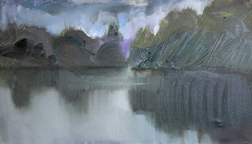 The painting attracts the eye with a palette of muted greys, which are interwoven with delicate tones of green and blue. In the center, we see a misty landscape, in which soft, blurred shapes resemble silhouettes of trees reflected in the calm surface of a lake. The composition of the painting is quite mysterious, as if the artist deliberately avoided clear contours, which adds a certain elusiveness to the work. The atmosphere is cool, and the mood is melancholic, as if it evokes the memory of an early morning just before a storm.