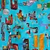 The painting exudes dynamic energy thanks to its vivid colors and abstract shapes. The dominant blue background resembles a sky full of undefined shapes that float and swirl. These shapes are a mix of warm reds, intense oranges and deep greens, giving the impression of spots floating on water. The composition is chaotic, but in this chaos there is a certain harmony, as if the elements were dancing in an invisible rhythm.