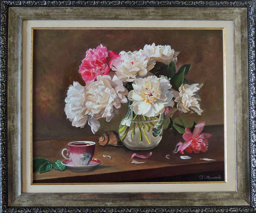 Tomasz Mrowiński - Oil painting peonies with a cup of tea