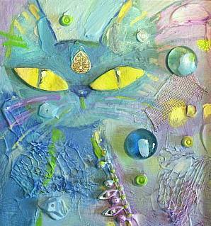 This painting is a true explosion of colors and textures. Pastel shades of blue, pink, and yellow dominate, creating a delicate, dreamy mood. The focal point of the piece is a pair of feline eyes, mesmerizing with their vivid yellow and almond shape. Around them, the artist used various techniques, such as impasto, to give the painting a three-dimensional quality. There are also individual elements resembling beads or mesh, which add structure and depth. The painting exudes mystery, as if it were hiding some magical stories. The style is a bit like a messy dream, which gives it a unique charm. One could say it is “fascinating” in the way the elements come together. Looking at this painting, I imagine a cat leaping through a rainbow. Emotions? Hmm, there’s something gently unsettling here, as if the painting were breathing with a life of its own. I wonder whether the artist wanted to remind us of childlike imagination, the kind that allows us to see what is invisible to the naked eye. It somewhat reminds me of a fairy tale in which anything is possible. Or maybe it’s simply a cat from a magical world. Interestingly, the textures in the painting evoke the touch of velvety fur, which engages the senses even more. This painting is like a cat that purrs its secrets only to those who know how to listen.