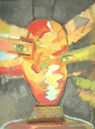 The painting shimmers with vivid shades of red, yellow, and green. The face in the center seems to be at the heart of an explosion of color, like a sun flaring in the darkness. Simple, geometric shapes give it an abstract character. The darkness of the background contrasts with the bright colors, creating the effect of a dramatic play of light and shadow. The composition is dynamic, as if flames were dancing around that central figure. The atmosphere of the painting is lively and full of energy. You feel that there is something magical about this face. Perhaps it’s the mystery? The artistic style blends Cubism with Expressionism, evident in the unconventional distortion and the intensity of the colors. The artist used impasto techniques, which can be seen in the thick, expressive brushstrokes. This painting can make you feel as if you were looking at something ‘out of this world’. It can be perceived as a meditation on the human soul, as if someone were speaking to you about the struggle between emotion and reason. Looking at it, I think I would feel fascinated and a little lost. Imagine what a seven-year-old might say: “Those eyes are like mysterious green flashlights!” Every viewer may feel something different, but one thing is certain: this work doesn’t let you walk past it indifferently.