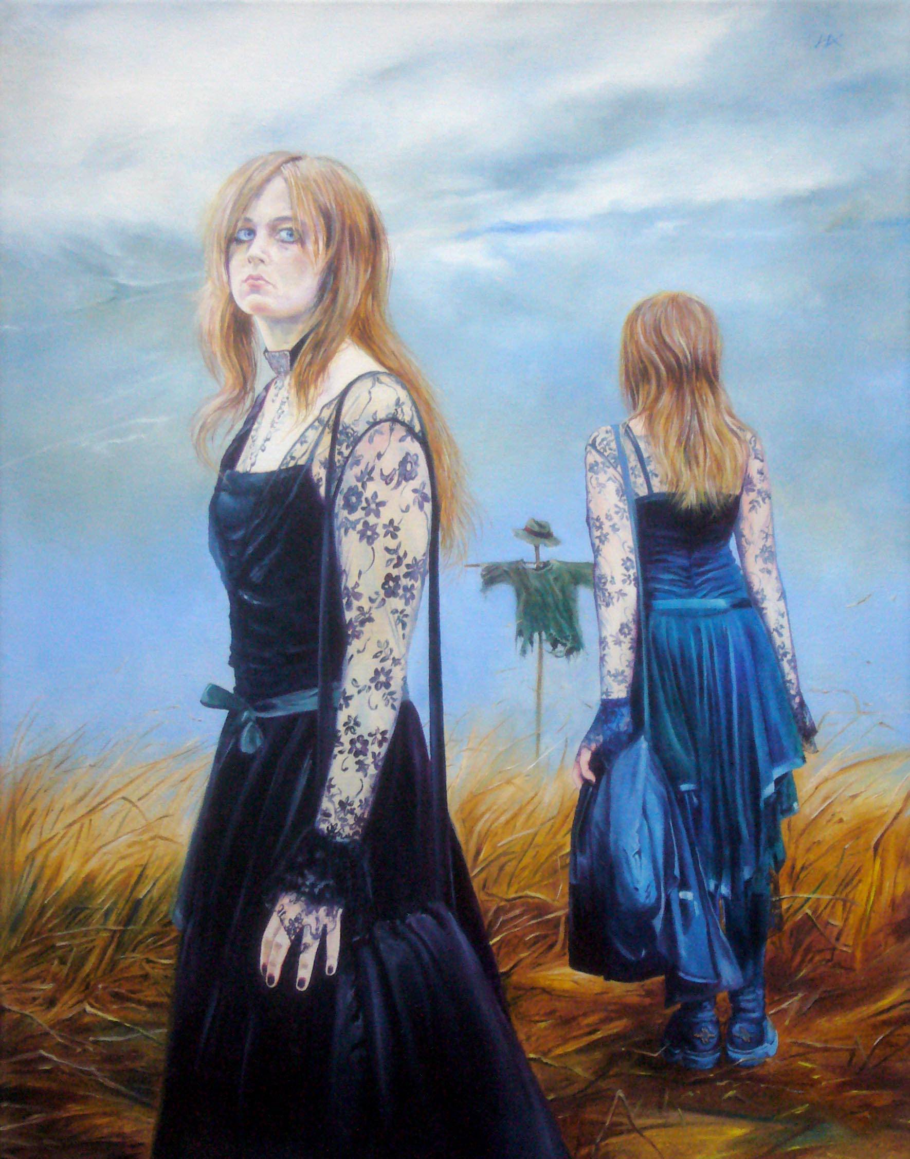 The painting depicts two figures. A woman with red hair and delicate features, dressed in a black gown with lace sleeves. The background is an endless sky, muted clouds, and a field of golden wheat. The colors gently blend into one another, creating a harmonious composition. In the background, a second figure, turned away, seems to be an echo of the first. The scene beckons with calm and mystery. The atmosphere is somewhat somber, like an autumn afternoon. You can feel a slight unease and a shiver of emotion that briefly takes hold of the mind. The artist employed realist techniques, highlighting details and the texture of the fabric. The woman’s dress seems to ripple under an invisible breath of wind, and the lace patterns bloom like flowers at night. The painting evokes a variety of emotions, from nostalgia to contemplation of the meaning of identity. It’s like looking into the eyes of an untold story. Imagination goes into overdrive. Perhaps it’s a scenario for a tale about two halves of one soul. Sometimes I feel that the same melancholy that lives on this canvas lives in me. I look at her and think: I wonder what her gaze conceals?