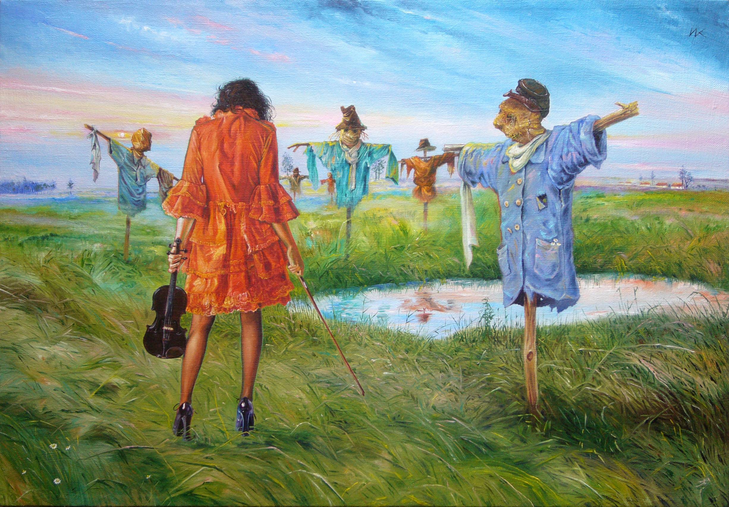 The painting depicts a girl in a red dress standing in a green meadow. Stretching out before her are scarecrows in brightly colored clothes. Their shapes and poses resemble an almost improvised dance. The saturated colors—the lush green of the grass, and the oranges and blues of the outfits—form a harmonious composition that draws the eye. The sky is lightened by pale blue streaks, adding a feeling of calm and spaciousness. The atmosphere is somewhat magical, with a hint of dreamy mystery. The artist has used realistic techniques, paying particular attention to details such as the texture of the materials and the light caressing the grass. It may be oil painting—a medium that conveys a richness of color and depth. The painting can stir a variety of emotions. For some, it is nostalgia for childhood; for others, an adventure in nature. One might feel invited to an improvised “melody” balanced between playfulness and reflection. Looking at this painting, I feel calm. It is like a slice of another time, another world. I think there is a bit of childlike joy in this scene. Wow, what a great dress! Such a sight also prompts the question: what will happen in a moment? It's a moment frozen in time, giving viewers a moment for their own dreams and memories.