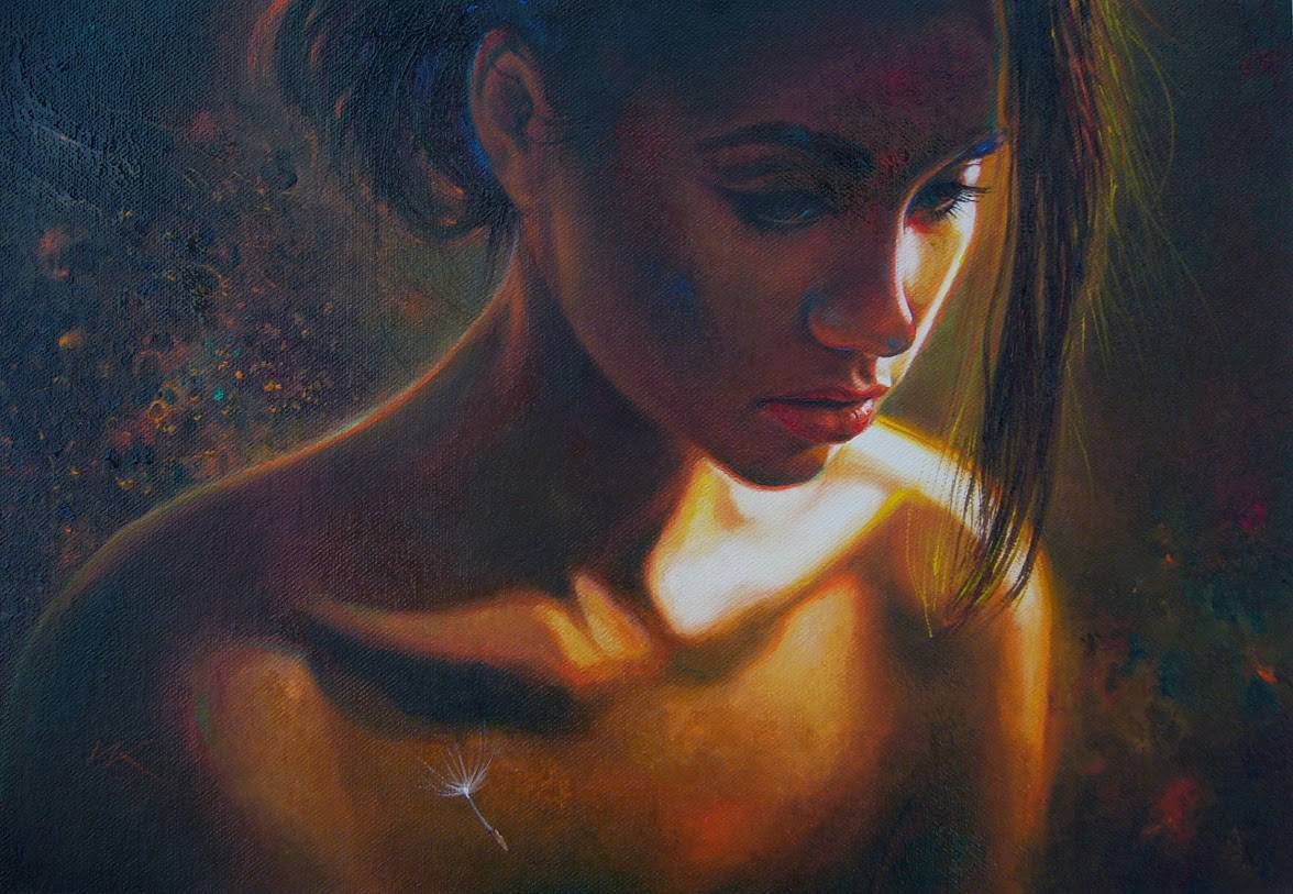 The painting depicts a young woman immersed in a subtle yet striking play of light and shadow. The colors are richly varied—the dark background contrasts with the warm tones of her skin. Light falls gently on her face, accentuating her striking features and the emotions hidden in her eyes. It is the kind of portrait that speaks to the viewer in a whisper, beckoning you to delve into the intimate world portrayed on the canvas. It reminds me a bit of the moment when the wind stirs the branches of trees and you pause to feel it. The artist has employed a masterful chiaroscuro to evoke a mood of contemplation and introspection. The combination of delicate brushstrokes and intense detail builds an atmosphere of calm and reflection. Looking at the painting, one can feel a kind of “tranquility.” The captured moment recalls the fragility of emotions, which can vanish in an instant like a dandelion puff on the wind. This work of art conjures feelings of warmth, closeness, and at times even nostalgia. A little sad, but in a good way. As a small child might say: “That lady is thinking about something really important.” The viewer may interpret it in many ways, but to me it speaks of inner strength and quiet determination.