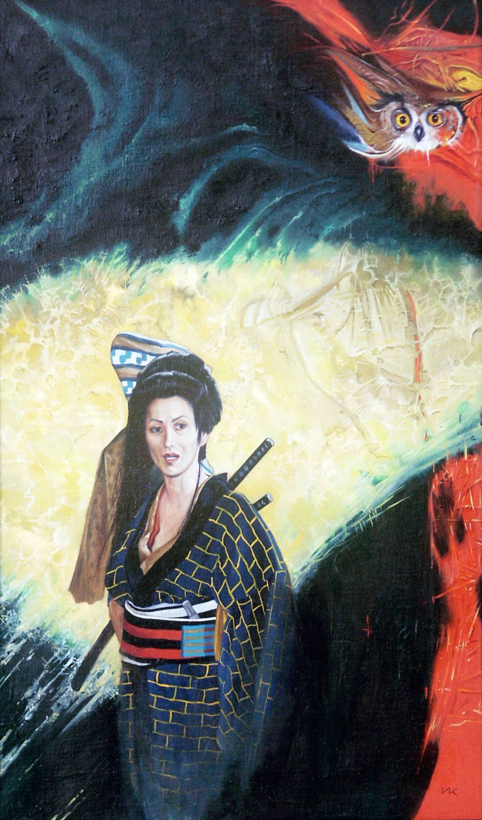 This painting is a true emotional mix, full of contrasts and symbolism. It is dominated by a play of dark, deep colors—black, navy, and intense red—which give the whole an almost dramatic tone. The central figure is a woman in traditional Japanese attire. Dressed in a kimono rich in details and geometric patterns, she draws the eye with her confidence. Beside her, at the boundary of light and shadow, a wide-eyed owl lurks, adding an element of mystery and uncertainty. And there’s a shadow that looks like a ghost! The composition is dynamic—the sinuous lines and color contrasts create an atmosphere of tension. The artist uses oil techniques, guiding the brush with a lightness that emphasizes the subtlety of the details. The painting is somewhat like a dream, where reality mingles with fantasy. The mood? Dark and intriguing. Looking at this scene, one senses a strange mix of calm and unease—like in a thriller, with something lurking just around the corner. This work invites reflection on inner strength and the secrets hidden within each of us. A fascinating artistic “mash-up” that will certainly linger in the memory.