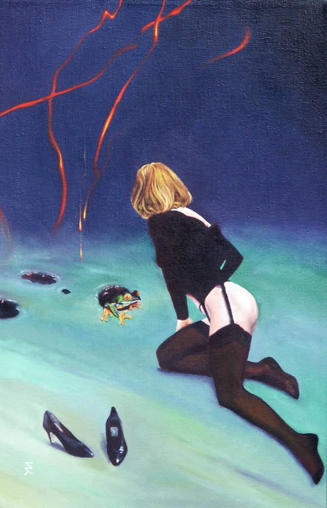 The painting exudes a mysterious, surreal atmosphere, dominated by intense colors and surprising juxtapositions of forms. The background is filled with a deep blue that shifts into delicate greens, which gradually brighten toward the bottom. In the foreground there is a blonde woman dressed in an elegant black outfit. She is kneeling, looking at a frog jumping nearby, which may symbolize unexpected twists of fate. The composition is extremely dynamic, and sharp red lines in the background, like lightning, add drama. The painting appears to be a blend of realism and abstraction. Working in oils, the artist achieved soft tonal transitions that draw the viewer into a dreamlike mood. This piece can evoke a range of emotions—from contemplation to slight unease. It may also provoke reflection on the relationship between humans and nature. Looking at the painting, I feel a specific “vibe” of mystery and uncertainty, as if reality could suddenly fall apart. A description a 7-year-old might come up with could be: “The lady is playing with a frog, and the shoes are lying by themselves.” This painting is a perfect example of how art can move the imagination, combining simplicity with emotional depth.