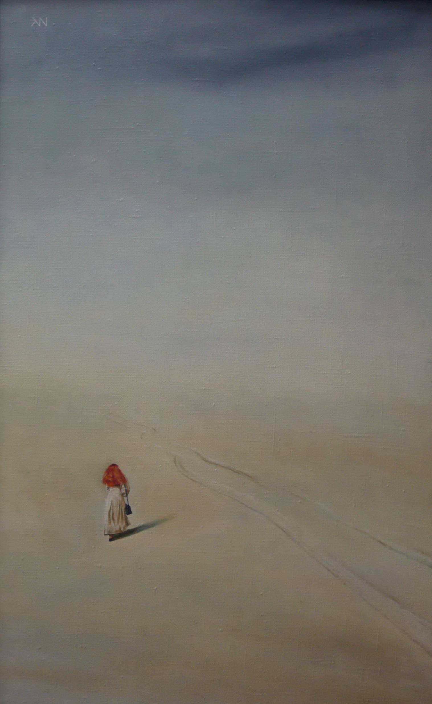 The painting is characterized by a minimalist composition dominated by a desert landscape. Subtle beiges and sands, gradually blending into the soft blues of the sky, create a pastel palette. The focal point is a figure in a red coat, whose vivid color draws the eye. The figure appears to be traveling alone across the vast expanse of the wasteland. The atmosphere is nostalgic, almost melancholic, yet it radiates calm and contemplation. Artistically, the piece is rendered in a style that somewhat recalls Impressionism with a touch of realism. Delicate brushstrokes emphasize the subtlety of the landscape while preserving realistic details of the figure. Such a composition may evoke in the viewer a sense of disorientation, but also fascination. It may bring to mind dreamlike journeys, where everything seems to be on the boundary between reality and dream. “Wow, so much sand!” — that’s what a child might say looking at this painting. Personally, looking at this work, I feel a mixture of calm and uncertainty. It is like a challenge thrown at everyday life. The English word “freedom” perfectly captures the feeling of the boundlessness of this space. Despite its simplicity, this painting has a magic that makes every detail important and meaningful.