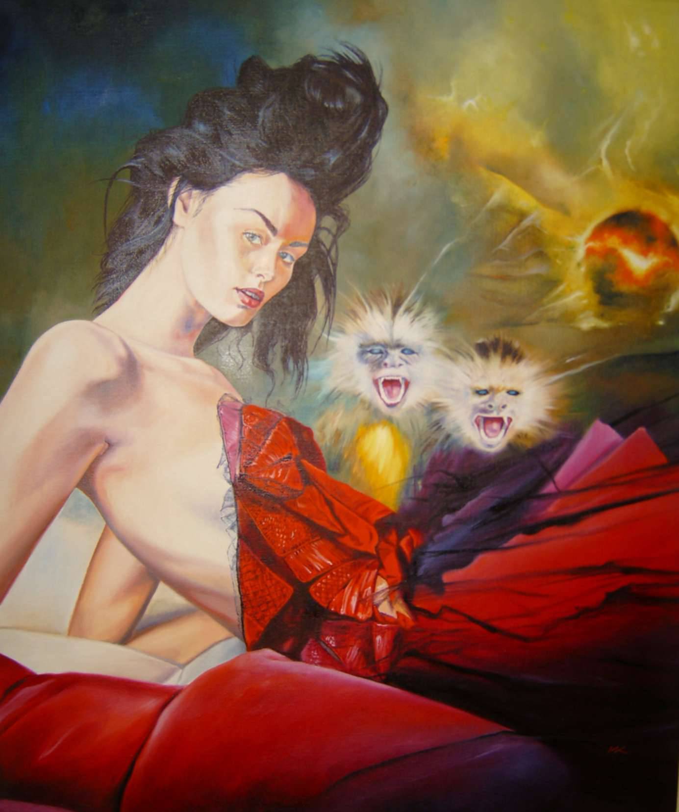 The painting captivates with the intensity of its colors and a dynamic composition. Deep reds and contrasting hues dominate, making the whole thing strikingly vivid. At the center is a woman whose hair looks as if it were dancing in the wind. Her outfit is a red chaos of ruffles and lace. The background is filled with two small monkeys, screeching with excitement. Their fur is bright, contrasting with the dark, dramatic sky behind them—like the world is about to fall apart any moment. The artist’s style is highly expressive, in which every detail is carefully thought out. The oil technique lends the work depth, and the light brings out what matters most in the painting. The atmosphere is tense and full of energy, as if something spectacular were about to happen at any moment. Looking at the painting, you can feel a mix of unease and fascination. Those little monsters look furious, yet funny at the same time. It’s as if I were watching a scene from a fairy tale, with something magical lurking just around the corner. Sometimes I feel the painting is telling me to surrender to emotions and open up to the unknown. It gives that “wow” feeling. Oh! And look at that red—an absolute knockout! I once saw something similar in a gallery, and it still intrigues me. I think the artist wants us to forget reality for a moment and immerse ourselves in the world of his imagination.