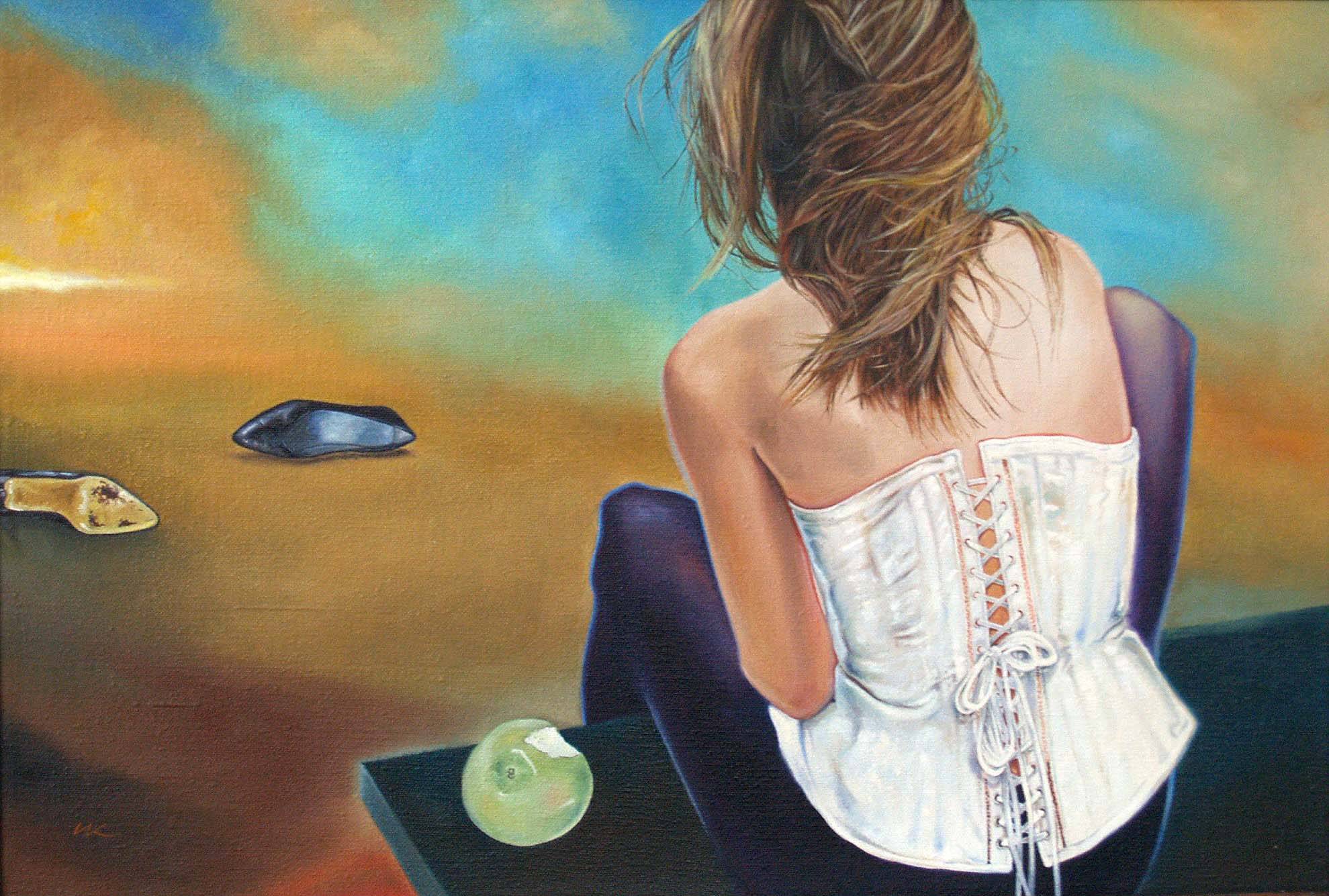 In the painting we see a figure seated with her back to us, wearing a white corset that contrasts with the dark background. The composition is dynamic, with a clear division between warm and cool colors. The background, shimmering with golden and blue hues, lends the whole a slightly surreal character. Streaks of color flow smoothly, reminiscent of dusk or dawn. I’m sure the artist used oil paints, which give the painting depth and subtlety. The atmosphere is a blend of nostalgia and calm—perhaps even mystery. It prompts the viewer to reflect on the fleeting nature of the moment. Perhaps it is a dream or a memory, hard to grasp, as fleeting as a dream. “I wonder what she sees there?” a child might ask. This “dreamlike” impression the painting gives may recall moments of contemplation, when you simply sit and gaze ahead, analyzing nothing—like the woman. The emotions it evokes are sometimes sadness, sometimes curiosity. Looking at this painting, I feel as if I were standing on the threshold of the realm of imagination, unsure of what awaits around the bend.
