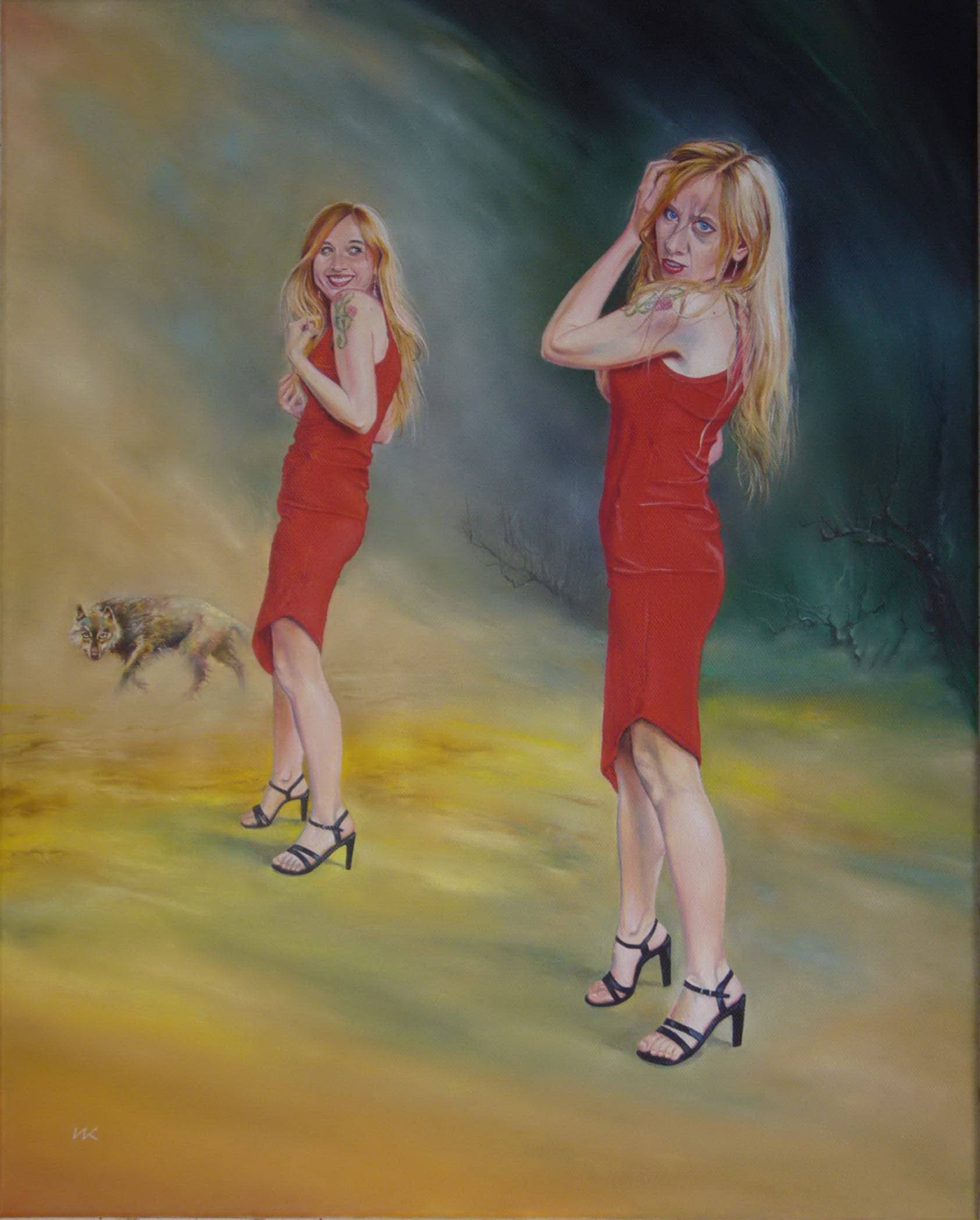 The painting depicts two female figures in red dresses against a blurred, slightly surreal setting. The background colors shift from greens to yellows, creating a variegated composition that draws the eye. In the foreground, the two women stand out with clarity and with the contrast of the intense red against the rest of the image. The artistic style is realistic yet tinged with a touch of magic, as if it were part of a dream. The atmosphere is mysterious, almost dreamlike, which may evoke a sense of uncertainty and curiosity in the viewer. The techniques used by the artist focus on the precise rendering of the figures’ details and a dynamic background. Subtle brushstrokes add depth and vitality to the whole composition. The presence of an animal figure in the background introduces an element of unease. A child might say, “Look, the lady is dancing with a little fox!” It’s so cute, isn’t it? The painting can arouse feelings of surprise as well as reflection on what is real and what may be only an illusion. While viewing this work, one can feel a mix of awe and unease. In the women’s faces, you can see self-confidence but also a hidden fear. This sense of uncertainty gives a distinctive twist to the interpretation. You might say it’s intriguing, right? For me, this painting is a journey into the recesses of the imagination, where reality blends with fantasy, and every figure has a story to tell.