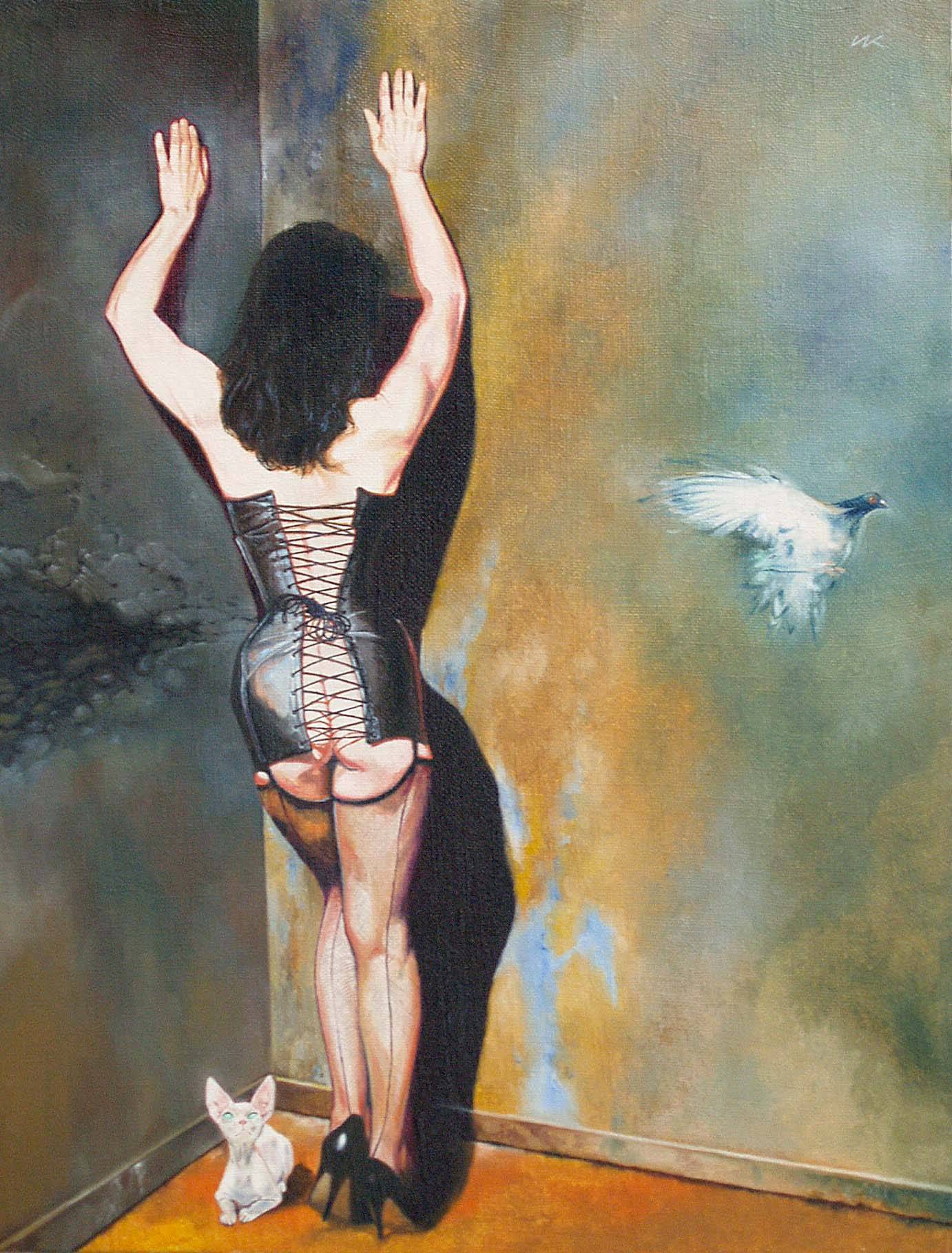 The painting exudes mystery and a hint of provocation. We have a dark background that dominates on the left, shifting into warmer, golden tones on the right. The central figure, turned toward the wall in an elegant gown, draws the eye with her unusual attire. Her hands are raised as if she wanted to touch the sky. Next to her, a white dove appears unexpectedly, its theatrical presence adding a surreal touch. And what is that kitty doing there? A fluffy white tomcat sits in the corner, observing everything with mild indifference. It’s so adorable! It’s impossible to take your eyes off him. The artist worked in oils, rendering details with finesse, and the interplay of light and shadow makes the painting almost come alive. It has a dream-like quality, where reality blends with fantasy. The painting may evoke a range of emotions: from contemplation, to a desire to uncover the story, to a slight smile at the sight of the cat. One might wonder what is actually happening here. The composition seems to be an invitation to interpretation, and perhaps even a reflection on loneliness and freedom. This work would surely catch the eye of anyone who sees it.