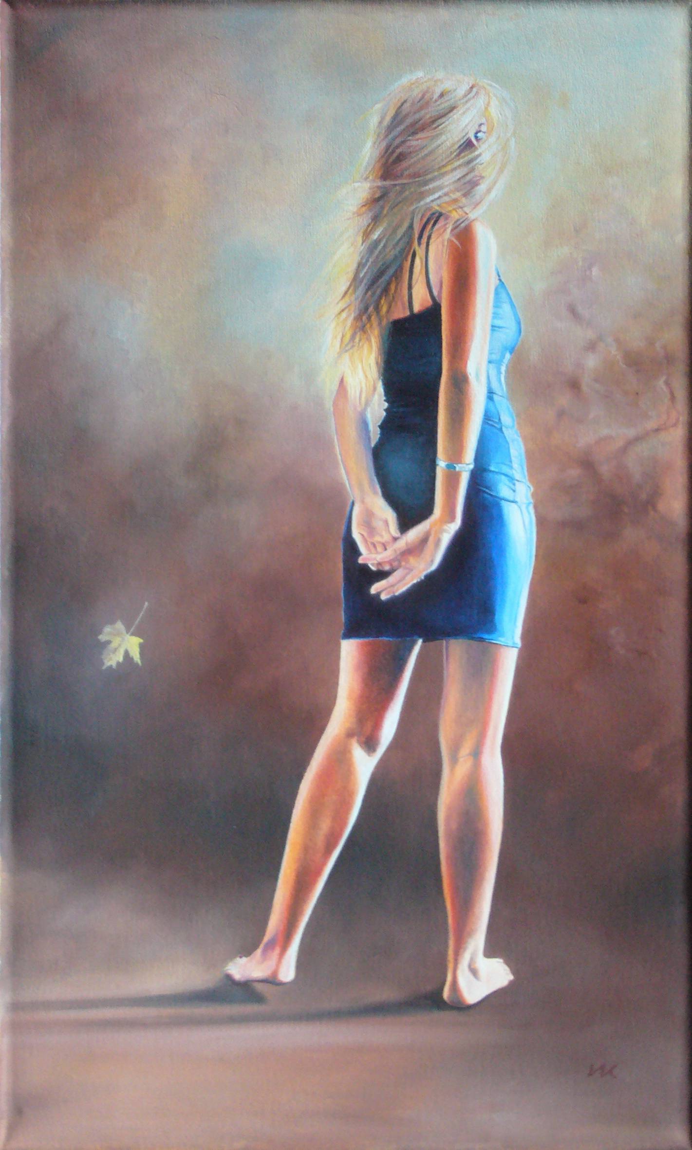 In this painting we see the figure of a woman standing with her back to the viewer. She is wearing a blue dress, and her blonde hair is gently blown by the wind. The colors are warm and earthy—browns and golden tones dominate, forming the background and lending the work a nostalgic aura. A single leaf lazily drifts down, underscoring the melancholy of the moment. The composition is simple yet remarkably expressive. There is something magical about it, like a cinematic moment frozen in time. The atmosphere is calm, perhaps even slightly pensive. A sense of freedom is palpable, but so is a feeling of longing. The artistic technique suggests oil painting, which gives the colors depth and texture, making them seem almost tangible. You can almost feel the softness of the hair and the coolness of the earth underfoot. The painting evokes various emotions. It may bring to mind summer evenings when time seems to have no meaning. For me, it has something of a “dream,” you know, that dream of freedom. As I write this, I feel warmth spreading through my heart. The painting would be perfect for a seven-year-old child who would say, “That lady looks like she’s playing tag with the wind.” It’s simple, yet full of beauty.
