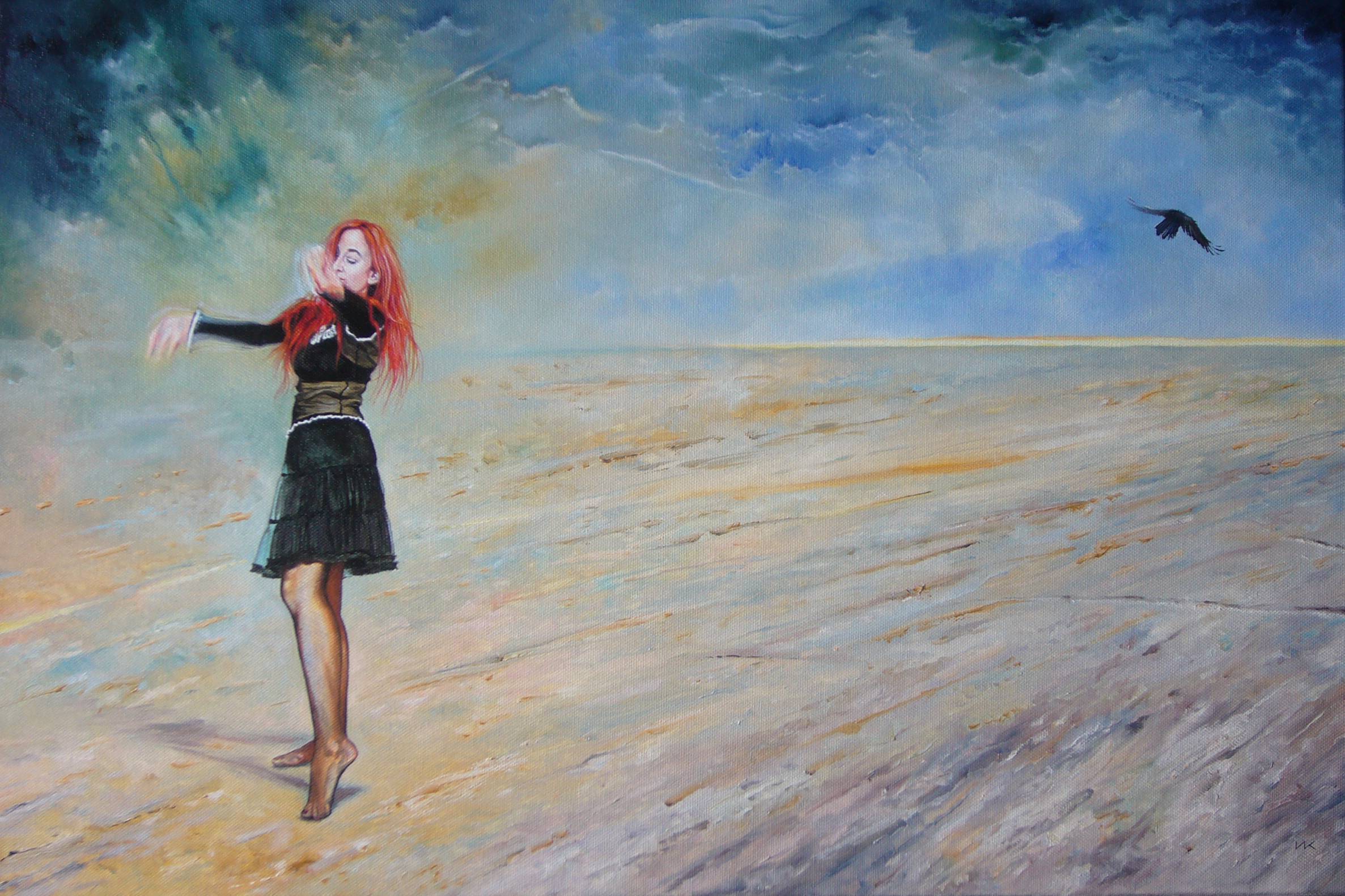 In the painting we see a solitary figure clad in a dark dress, with windswept auburn hair that contrasts with the bright, almost desert-like background. The woman stands in a vast, boundless expanse, seeming to be caught mid-dance or in motion, which lends dynamism to the entire composition. The color palette oscillates between golden shades of sand and clouds in tones of gray and blue, giving the whole scene a certain air of mystery. The atmosphere is slightly surreal, as if the figure were dancing on the edge of infinity. The painterly technique employs delicate brushstrokes, giving the landscape an almost soft texture that contrasts with the figure’s crisp lines. The viewer can feel both calm and a certain ironic sense of isolation that emanates from the work. The artistic style balances between realism and impressionism, inviting personal interpretation. For me, it is a painting about freedom and solitude, about seeking one’s place. And there is a bird in the sky, as a small kid would say, adding even more magic to this surreal moment. Standing before the painting, we feel as if the world has paused for a moment, leaving only us and that dancing silhouette. In part, we may also feel a certain nostalgia for something that never happened.
