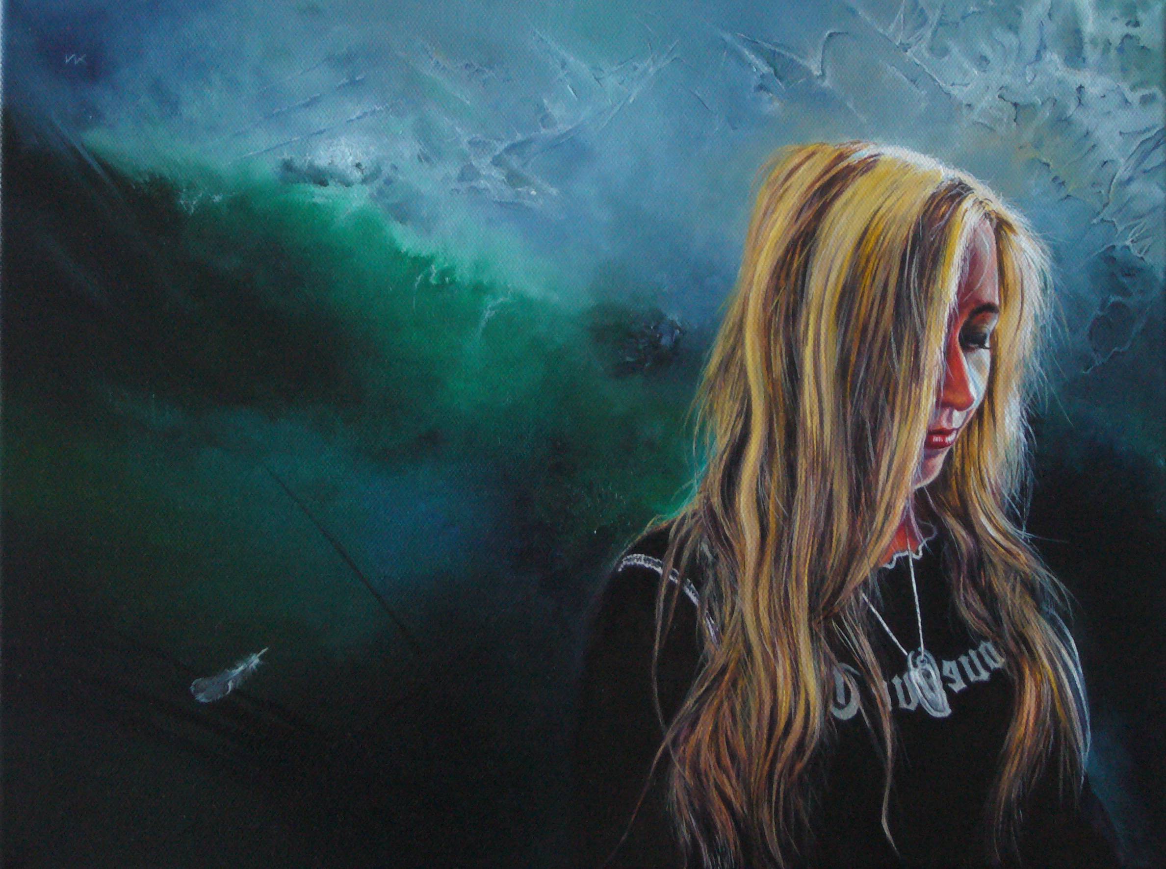 The painting captivates at first glance with its subtle play of colors. Cool shades of green and blue form a background with a dynamic texture that might resemble a stormy sky. Against this backdrop, the central figure is particularly intriguing. The bright strands of her hair contrast with the dark, almost Gothic attire. The composition seems to convey a mysterious mood, perhaps even a touch of melancholy. Stylistically, the artist works in oils, giving the painting great depth. Realistic and abstract elements intertwine, and the riot of brushstrokes creates a texture that feels almost palpable. It tells the story of a contemplative person, or perhaps someone lost in thought. It evokes a reflective mood, as if anyone could find something of themselves in that face. I think of a rainy night when I sat by the window and watched the drops slide down the pane. There is something very personal about it. If a child were to describe it, they would say: “This lady looks like she’s sad, but maybe it’s just the rain.” The piece draws in emotions and reflections, changing with each glance.