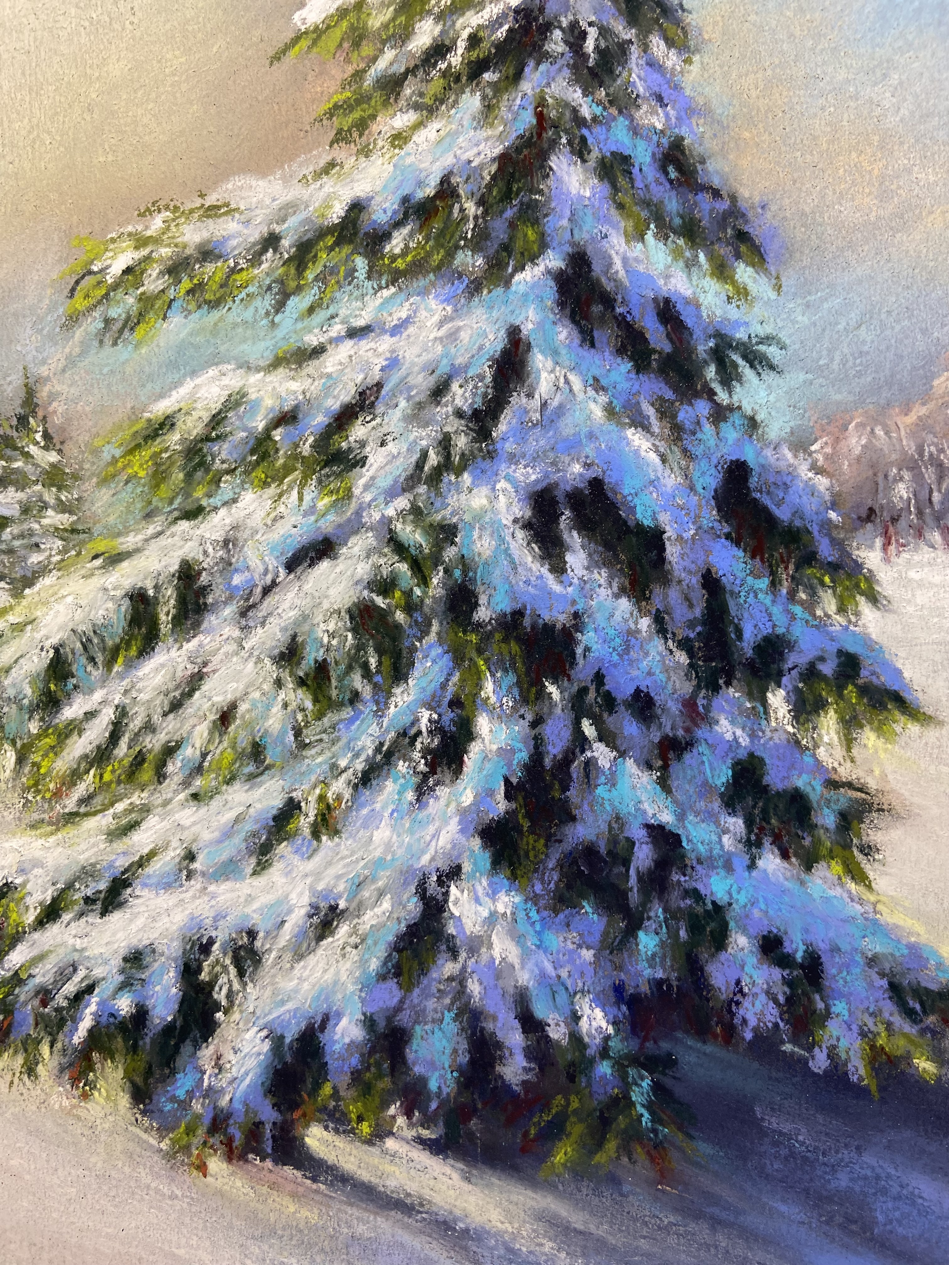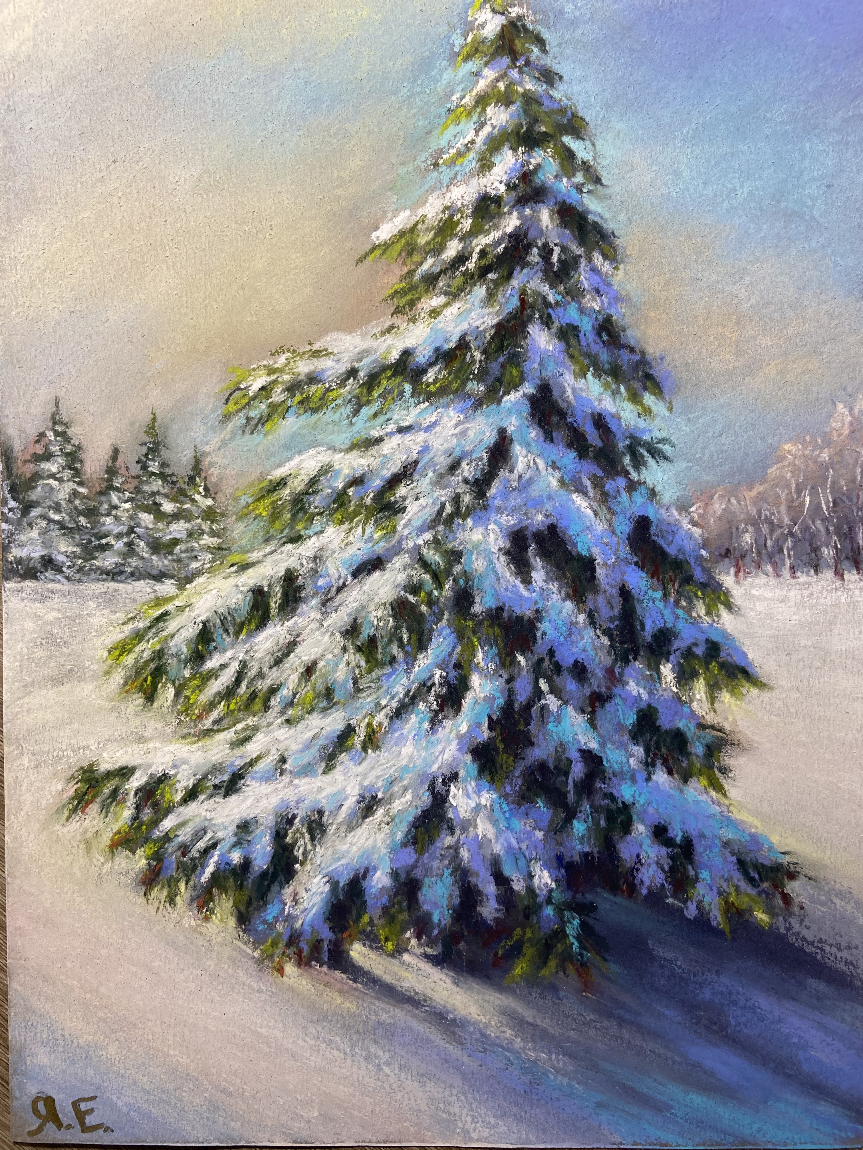 « ÉPICÉA DANSANT », dessin au pastel, paysage d'hiver