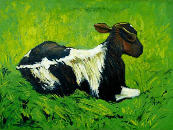 Il dipinto pulsa della vita dei campi verdi, dove su un’erba lussureggiante giace tranquilla una mucca. Dominano i verdi, che evocano una giornata estiva piena di sole e spensieratezza. La mucca, con la testa di un marrone scuro e macchie bianche e nere sul corpo, riposa con grazia, emanando calma e armonia con l’ambiente circostante. I suoi contorni sono nettamente marcati, il che suggerisce l’uso di una tecnica a tratto spesso. L’artista sembra adottare una tecnica impressionista, in cui rapide pennellate restituiscono la fugacità dell’istante. Guardando questo quadro, si può provare un senso di pace interiore e di rilassamento. "Chissà se alla mucca piace quest’erba", pensò il bambino. La scena appare idilliaca, come se il tempo si fosse fermato. L’artista ha saputo creare efficacemente un’atmosfera di ore che scorrono lente. Il suo approccio al colore è audace, dinamico, con un tocco di spirito libero. Il tono dell’opera è riflessivo e colmo di calore. Osservandolo, si può quasi udire il ronzio degli insetti e il lieve soffio del vento. È un’immagine che introduce a uno stato di serena beatitudine campestre, facendo venir voglia di essere lì, respirare a pieni polmoni e semplicemente godersi l’istante.
