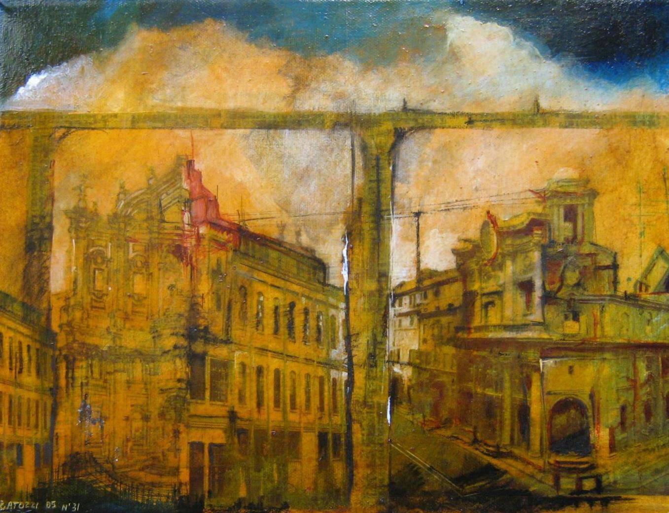 Il dipinto è un vero capolavoro nelle calde tonalità del giallo e dell'arancio. Gli edifici, con la loro complessa architettura, sembrano quasi annegare nella luce dell'ora d'oro. Le loro facciate sono ricoperte da ombre delicate, creando un profondo contrasto con il forte cielo azzurro. Le linee verticali della struttura giustapposte alle morbide nuvole sembrano raccontare una storia sul conflitto tra natura e città. La composizione, anche se abbastanza simmetrica, lascia un po' di disordine, riflettendo il caos della vita cittadina. L'artista ha utilizzato la tecnica della miscelazione dei colori ad olio, che conferisce all'opera una morbidezza e una consistenza uniche. L'atmosfera del dipinto è un ritorno nostalgico al passato, pieno di fantasticheria e riflessione. Potresti sentirti un po' ansioso, come se fossi appena prima di una tempesta. Le emozioni che evoca sono un misto di riflessione e ammirazione: la vita in città è così complicata? L’immaginazione è la chiave che apre la porta al passato. Vedere gli edifici mi ricorda il tempo in cui giocavo con i blocchi e costruivo le mie città. Vorremmo toccare quest'opera per sentirne meglio l'energia e la storia complicata.
