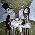 Il dipinto rappresenta una scena intrigante con due figure sedute a un piccolo tavolino rotondo. Il tutto è reso in delicate tonalità pastello. Sullo sfondo si staglia un rigoglioso albero, che dona alla composizione un clima sereno e idilliaco. Un ragazzo con un elegante cilindro e una ragazza in un abito di tulle creano un’atmosfera quasi fiabesca. Mentre lui regge con cautela una tazzina, lei accarezza un gatto nero in grembo. Questo dipinto emana un’atmosfera tranquilla, da piccola cittadina, come in un racconto di Alice nel Paese delle Meraviglie. La tecnica dell’artista — lievi pennellate e sfumature sottili — crea un’impressione di delicatezza e di fugacità dell’istante. È come un sogno che per un attimo diventa realtà. Il quadro suscita nostalgia, il desiderio di momenti semplici, forse ci si perde persino in uno stato "dreamlike". Dal punto di vista di un bambino: "Forse tra poco berranno un tè magico con il gatto!" Dettagli del genere suscitano un sorriso e stimolano l’immaginazione, ricordando che nell’arte non ci sono confini. Lo stile passa con fluidità tra formalità e spontaneità, il che restituisce alla perfezione non solo il carattere del dipinto, ma anche la sua universalità.