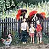 Nel dipinto troviamo tre bambini in piedi davanti ad un vecchio recinto di legno decorato con diversi grandi cappelli con piume rosse. I colori sono vividi, contrastanti: lo sfondo verde della vegetazione e l'azzurro del cielo sullo sfondo. La composizione attira l'attenzione al centro, dove i bambini si riuniscono con sorrisi pieni di spensieratezza infantile. L'atmosfera del dipinto è come l'estate in campagna, calda e piena di avventure. Lo senti? Il vento fruscia tra le foglie e gli uccelli cantano. Lo stile artistico è realistico, ricco di dettagli che fanno sembrare la scena quasi come una fotografia. Il pittore ha utilizzato pennellate sottili per trasmettere la trama dell'erba e delle foglie. La tecnica impressiona semplicemente per la precisione dei dettagli. Guardando questo dipinto, puoi sentire un tocco di nostalgia, che ricorda la tua infanzia piena di divertimento nella natura. E' un'immagine che porta il sorriso e la leggerezza nel cuore. Potrebbe sembrare che tu voglia saltare lì e correre con loro! È tutto così magico. Colorati, come direbbe un bambino: "Voglio anch'io i cappelli così!" I pensieri volano come farfalle in giro!